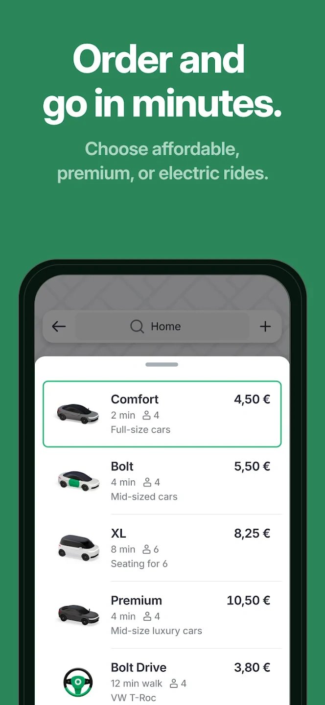 - Wide Vehicle Selection: Choose from various vehicle categories such as Bolt Express (economy), Bolt Standard, Bolt Premium, Bolt Large, Bolt Van, or Bolt Cargo, depending on passenger capacity, cargo needs, or specific requirements. This extensive range makes Bolt suitable for everything from solo commutes to group transport and specialized deliveries, addressing a broad spectrum of transportation needs with one service provider.