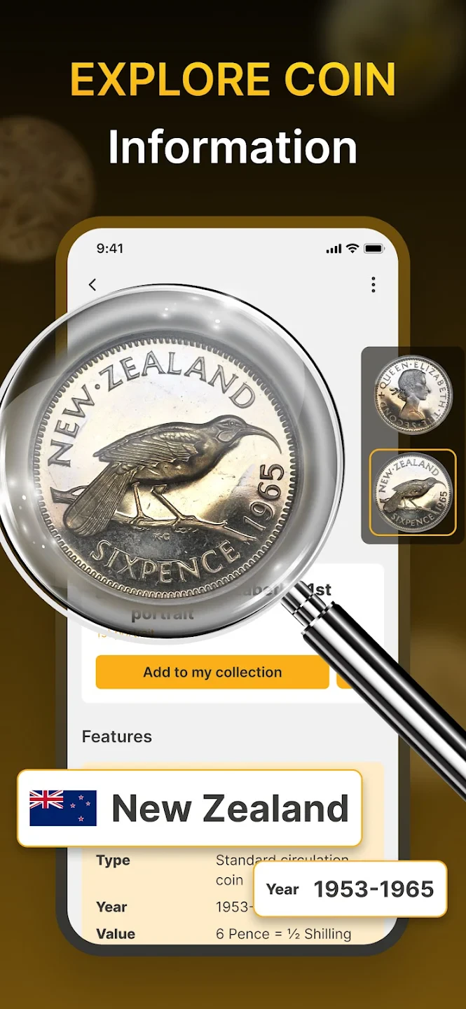 • Visual Recognition: Instantly identify coins by selecting from a comprehensive database or using your phone’s camera – perfect for identifying unfamiliar foreign coins found during travel or at flea markets, providing not just the denomination but historical context too.