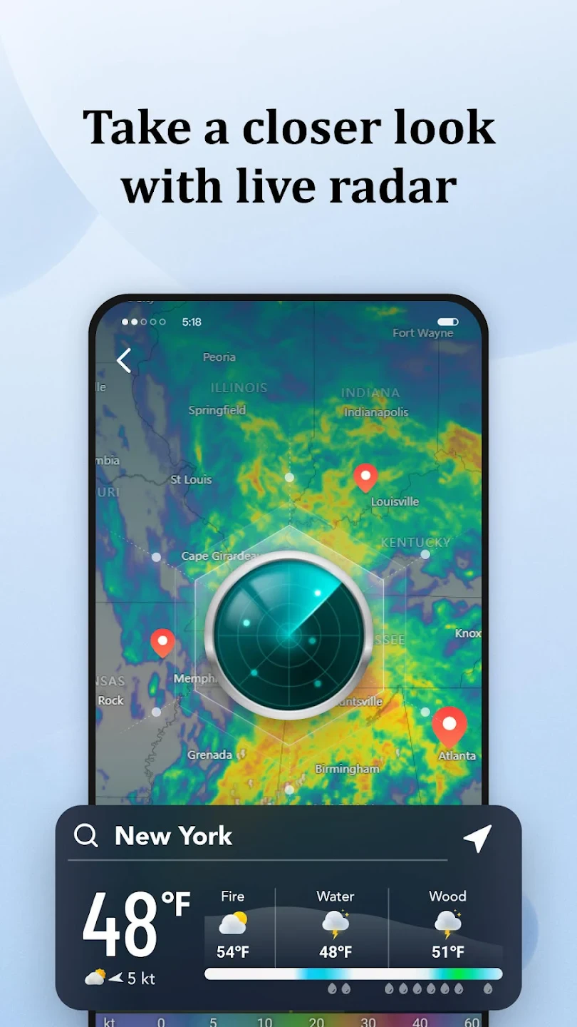 • Real-Time Radar Visualization: Instantly view evolving weather systems through detailed radar imagery that updates frequently, allowing you to track storms and precipitation patterns. This feature helps you quickly understand current conditions and anticipate changing weather before it impacts your activities.
