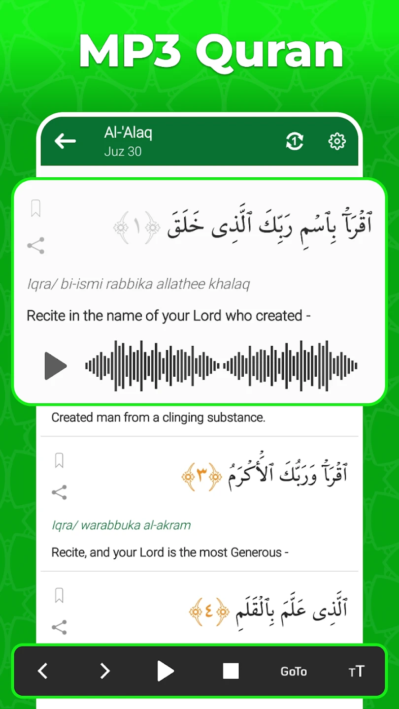 - Multilingual Verse Display: View Arabic text alongside translations and transliterations in your preferred language with customizable font sizes for comfortable reading, enhancing comprehension for beginners while preserving the original text.