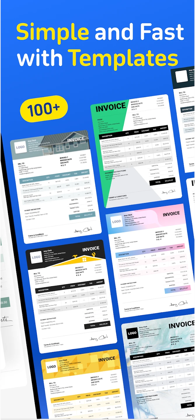 - PDF Export & Email Integration: Easily export invoices and estimates as high-quality PDF documents ready for printing, emailing directly to clients, or sharing via other digital platforms, ensuring documents are sent promptly and look perfect on all devices.