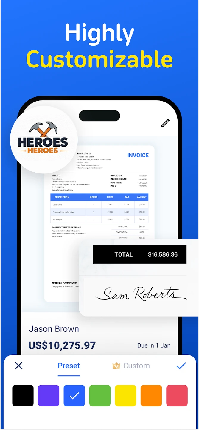 - Custom Branding Templates: Users can personalize their invoices and estimates with company logos, specific address formats, and branded letterheads, even offering the option to set default company details, ensuring all documents maintain a consistent and professional appearance.