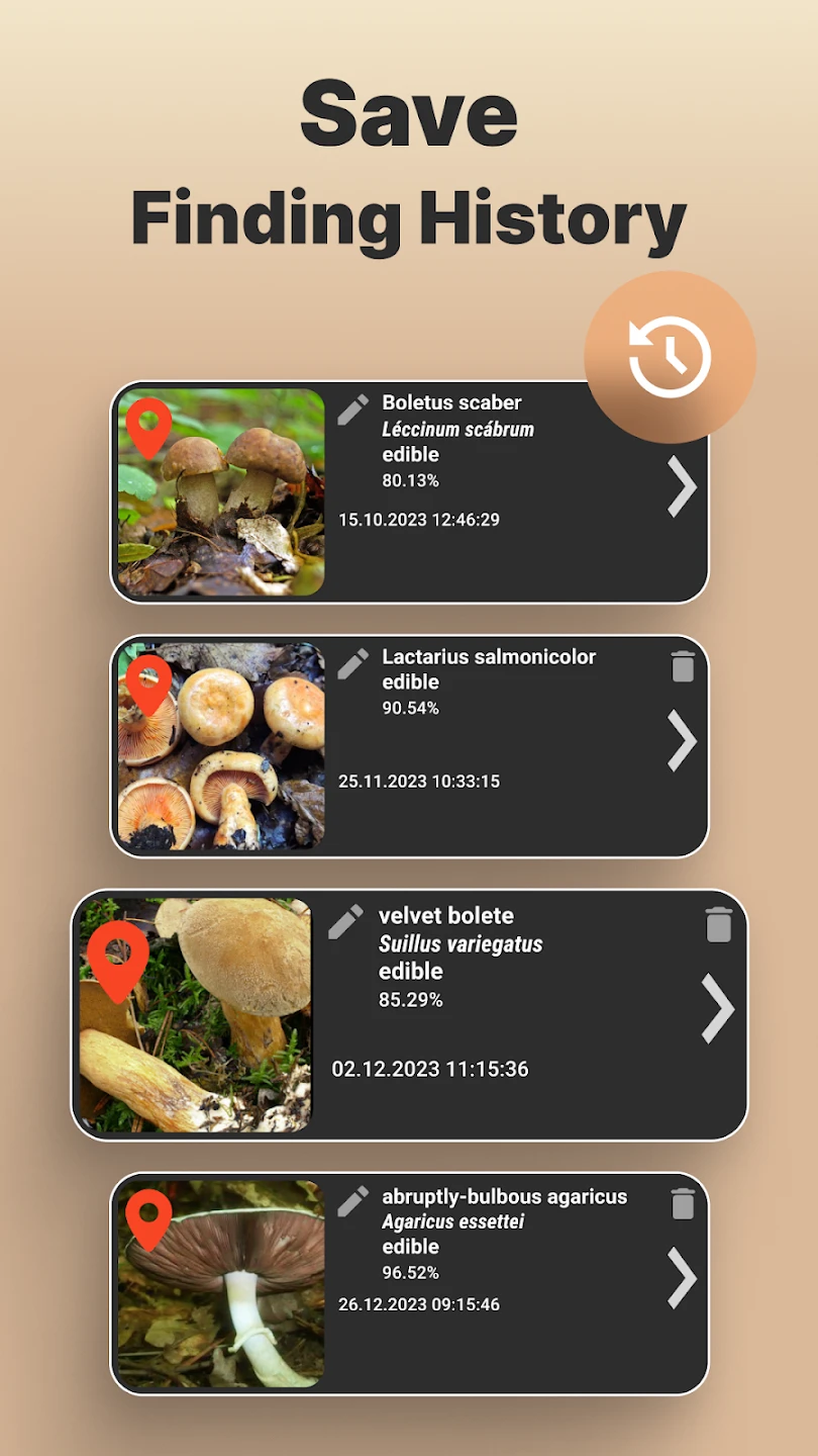 • Harvesting & Tracking Journal: Log your mushroom finds with species name, date, location (GPS), quantity, and condition. You can take photos directly within the app at the time of identification. The app maintains a personal database for your finds, allowing you to track your discoveries, note observations, and develop a personal inventory of encountered species.