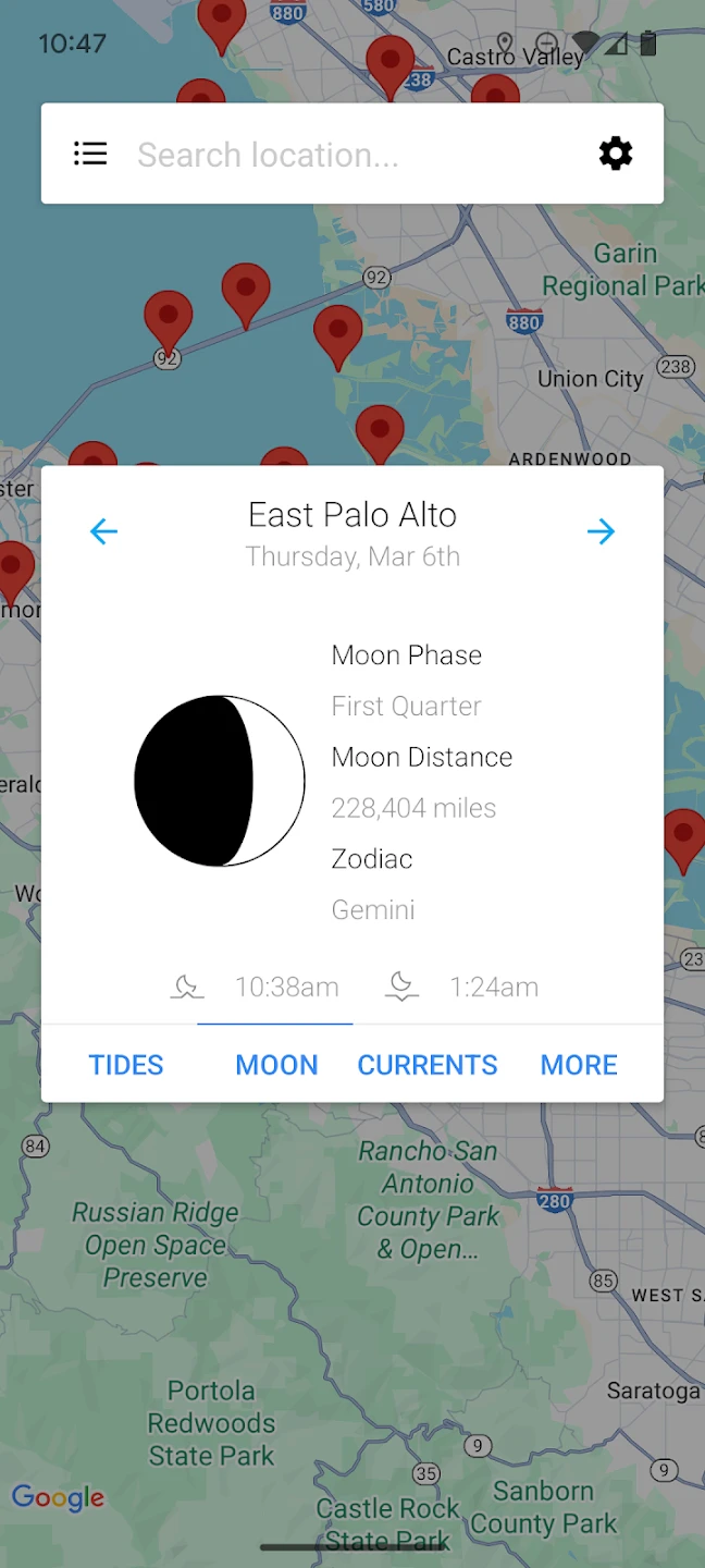 • Detailed Moon Phase Information: Beyond basic tide predictions, the app includes detailed moon phase data, explaining the current moon type (e.g., New Moon, Full Moon, First Quarter, Last Quarter) and its impact on tidal range, aiding users in understanding natural cycles and planning activities accordingly.Gain deeper insight into how lunar cycles influence tide predictions.