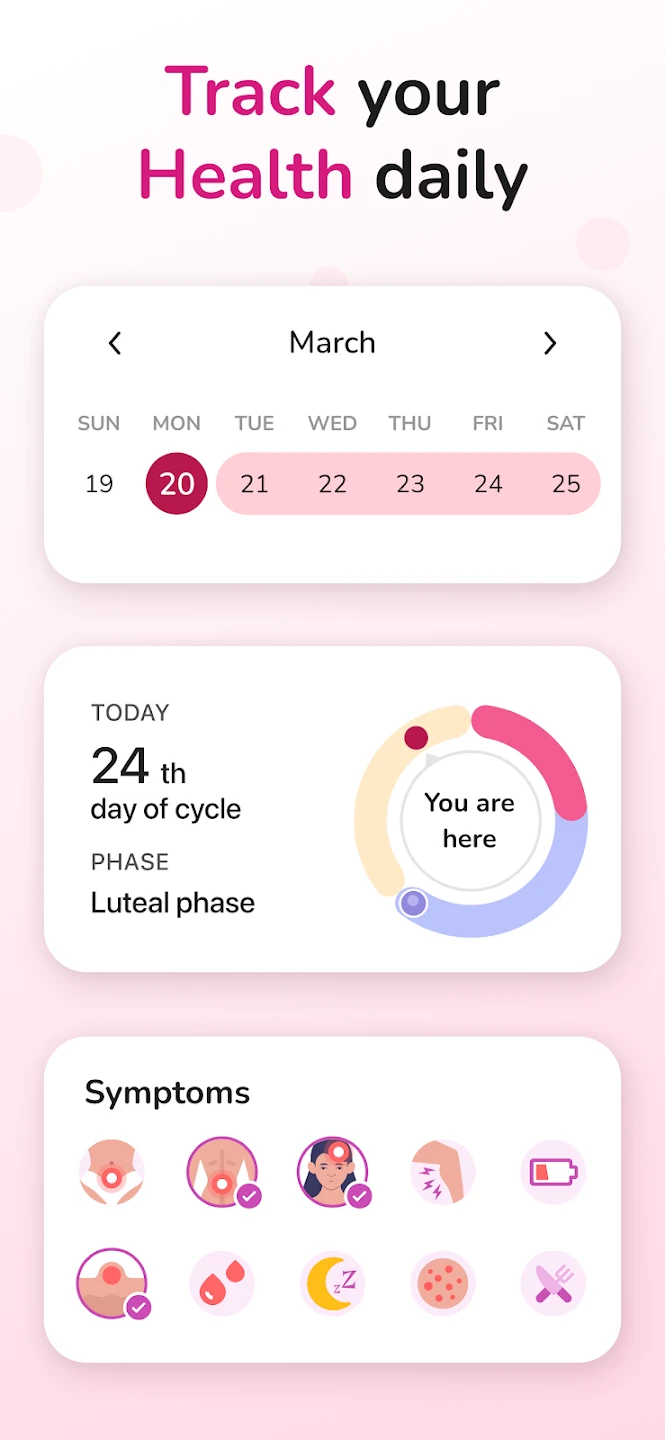 - Symptom & Mood Journaling: Allows users to log physical symptoms, emotional changes, and overall wellbeing throughout their cycle. The data visualizations help identify patterns between symptoms and specific phases, enabling proactive health management and better preparation for challenging times. For example, users can discover if certain foods affect their cycle or if specific exercises reduce cramping.