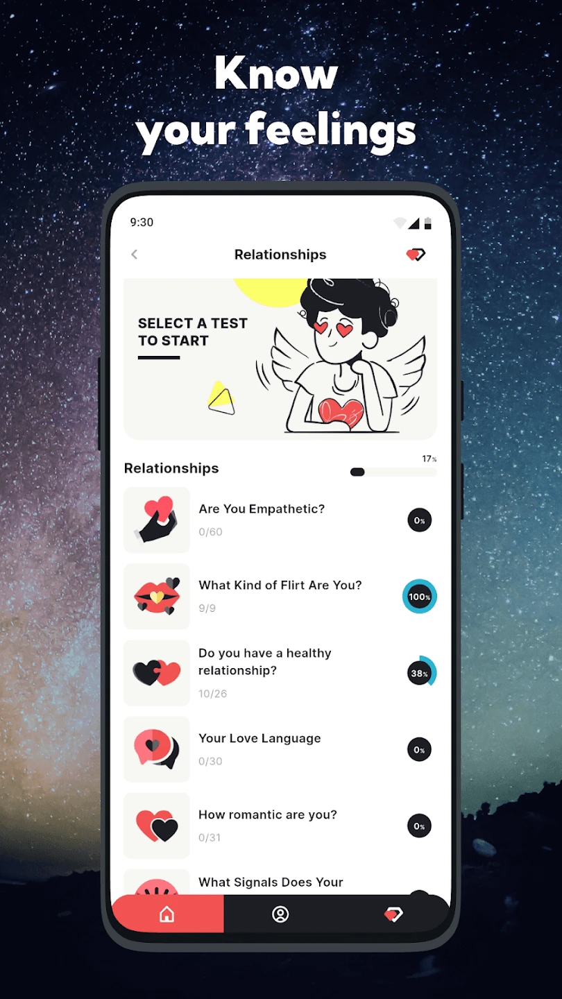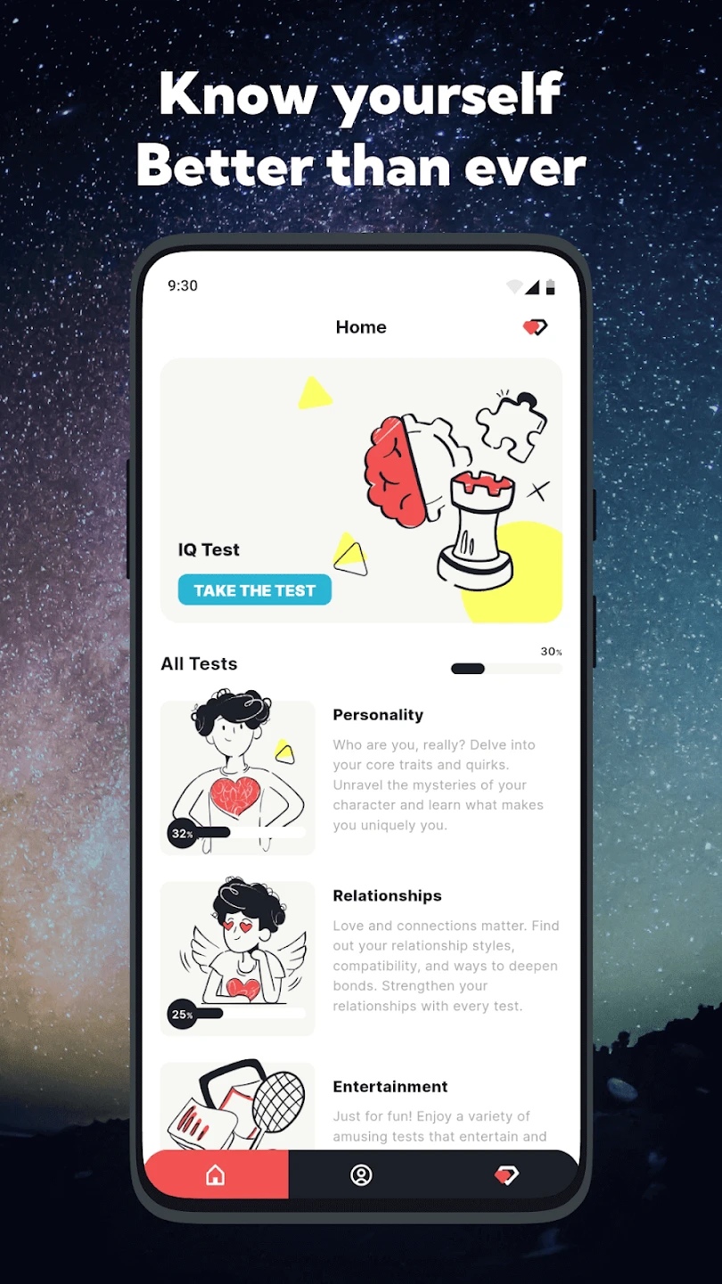 • Standardized Test Library: The app offers a curated collection of evidence-based assessments covering personality traits, emotional intelligence, stress levels, and career compatibility, providing reliable and relevant results tailored to different needs.
