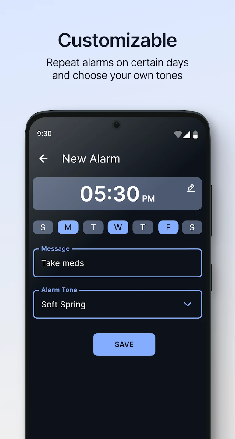 • Repeat Alarms: Define alarms that repeat daily from a start date to end date, or repeat on specific days of the week. This feature is perfect for setting consistent medication reminders or recurring appointments without needing to reset manually each time.