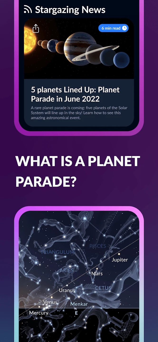 - Star & Planet Identification: Utilizing your device’s sensors and integrated telescope databases, this feature instantly identifies celestial bodies when viewed through the app. Specify the object size/threshold in settings for best results. It includes detailed information like magnitude, spectral type, distance, and associations. If you happen to spot an unfamiliar star cluster or a bright object late at night, activating this function instantly tells you its name, what it is, and points out interesting features.