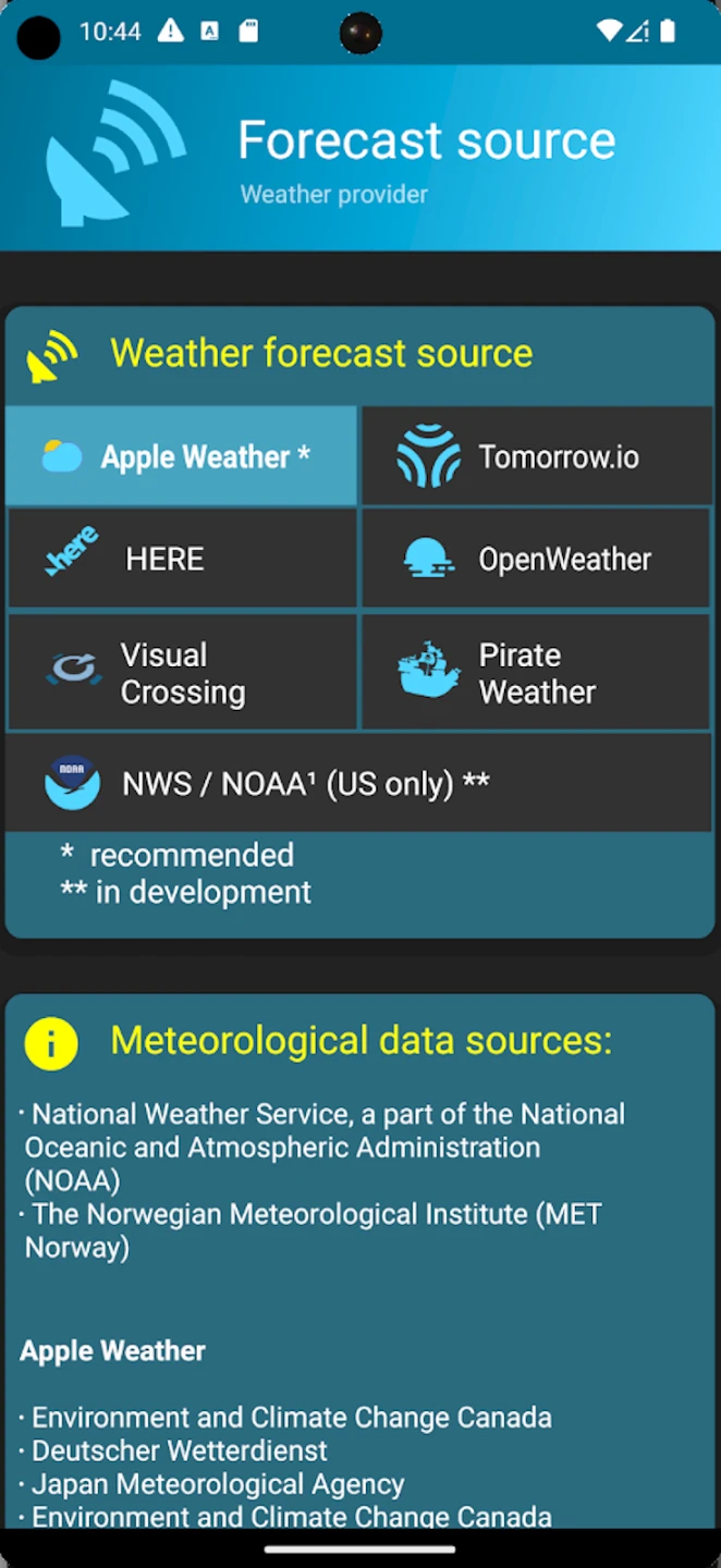 Offers hyperlocal weather predictions with detailed radar imagery. Known for detailed radar animations and specialized storm tracking tools popular with severe weather enthusiasts. |