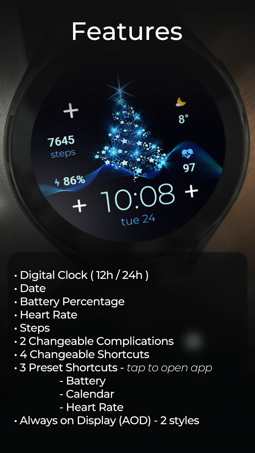 Designed for Wear OS. Includes a selection of animated holiday faces with easy swapping capabilities and sleek animations.