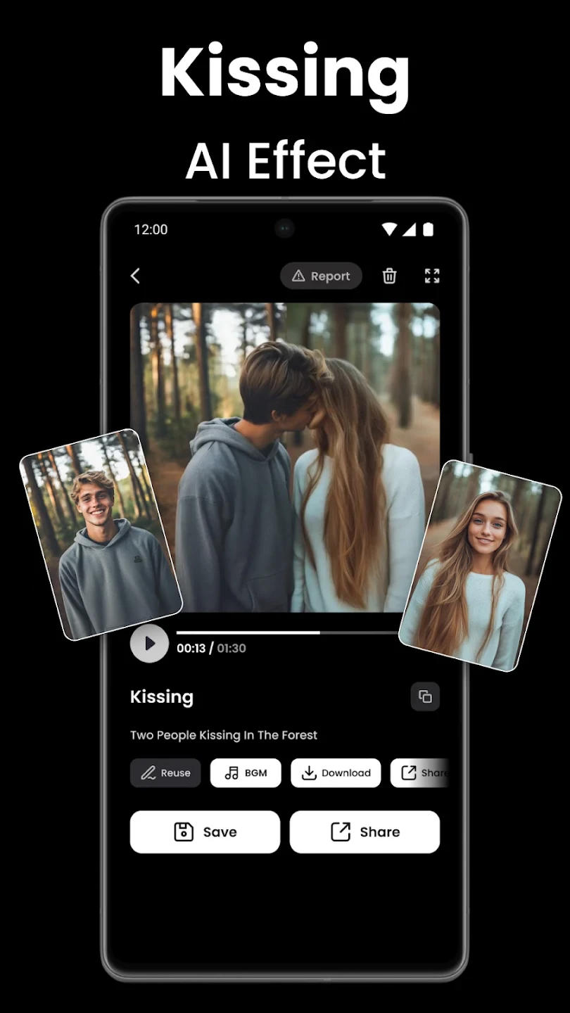 Video AI – AI Hug & Kiss Maker is an innovative mobile app that transforms ordinary video content into heartwarming scenes with digital affection and intimacy. By harnessing sophisticated artificial intelligence technology, users can easily add personalized hugs, kisses, and tender gestures to their videos, making special moments even more memorable for loved ones. This unique tool is perfect for creating touching greetings, anniversary messages, or heartfelt goodbyes that convey emotions in visually engaging ways.