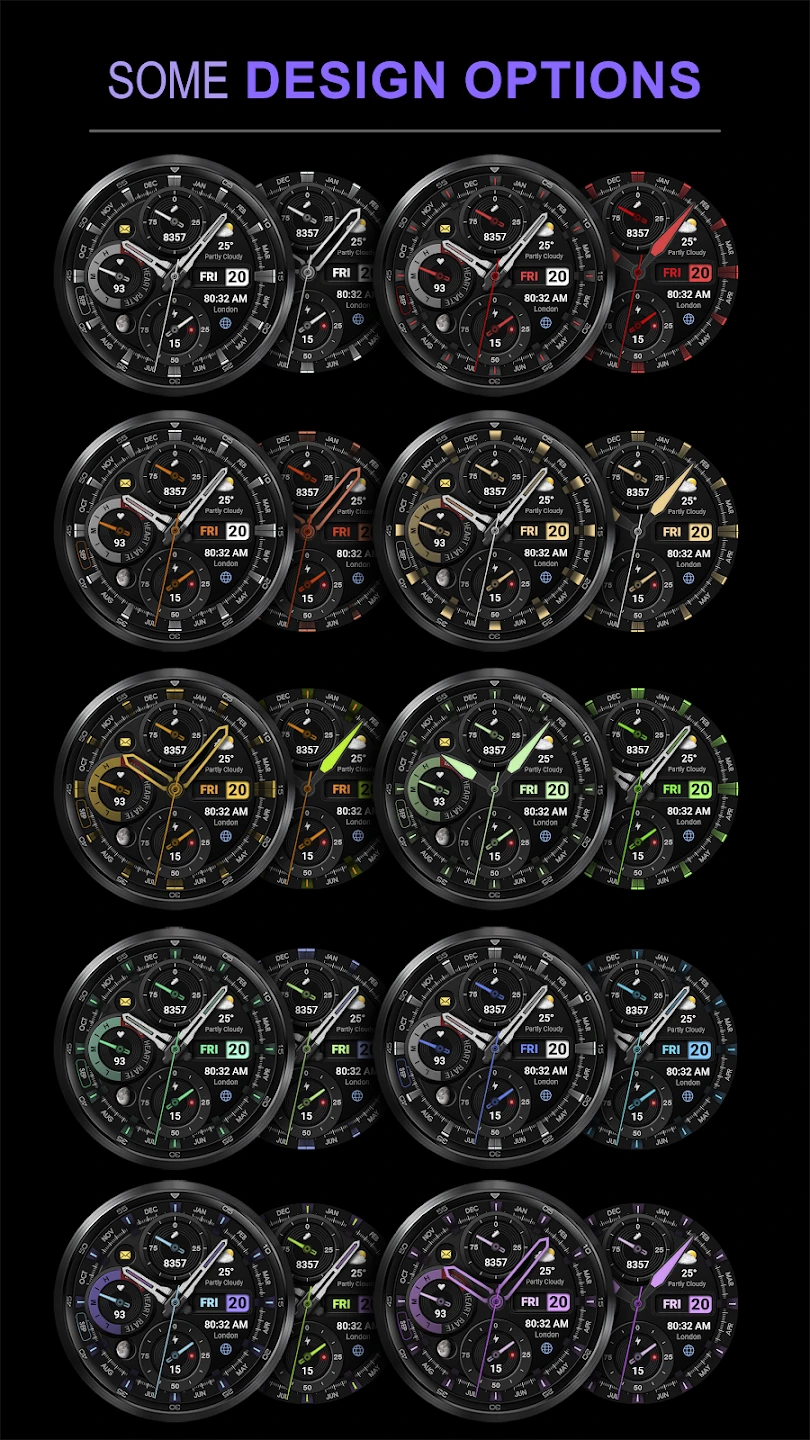 • Multiple Display Styles & Templates: Users can choose from a variety of base templates (e.g., analog, digital, minimalist, sporty) and apply complex animations, gradients, and transitions between them or individual complications. This enhances the user experience by allowing personalization beyond simple colors, enabling users to express their individual style and adapt the watch face to different occasions or activities, making the smartwatch feel truly their own.