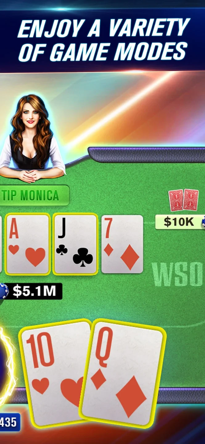 - [Modes or Levels]: Engage in Single-Player tournaments mirroring real WSOP events, Quick Games against AI opponents of varying difficulty, or Challenge Rooms. Each mode offers different stakes and objectives, providing substantial replay value through changing opponents.