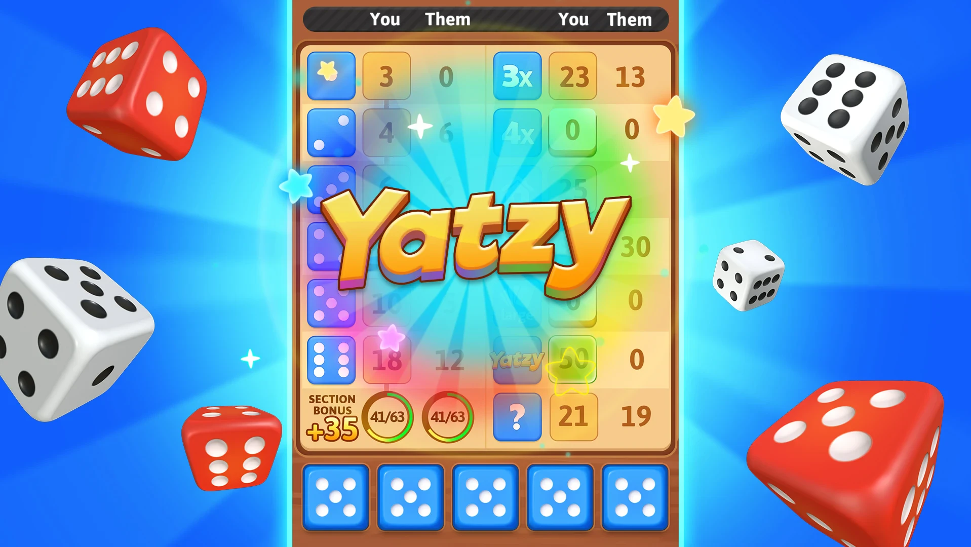 - [Core Gameplay Loop]: Players take turns rolling five dice to score points in categories like ones, twos, three-of-a-kind, full houses, and special combinations like Yahtzee/Yatzy. On each turn, you can roll the dice up to three times, strategically re-rolling specific dice to maximize your score potential for each category.